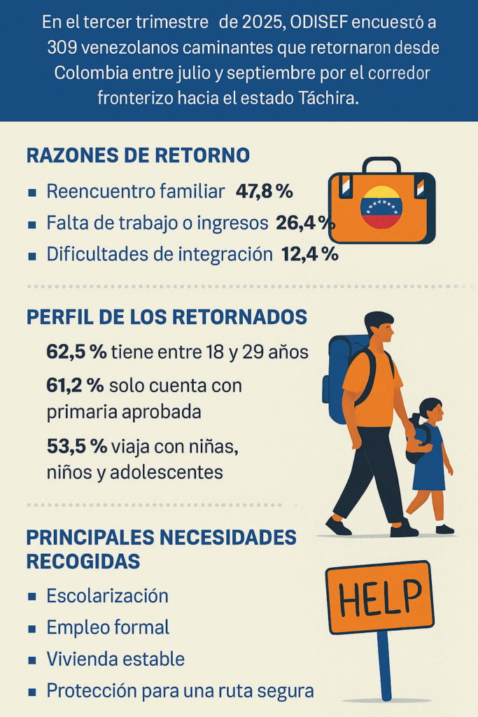Un reciente estudio del Observatorio de Investigaciones Sociales en Frontera (ODISEF) advierte que el retorno masivo de venezolanos se ha convertido en un proceso sostenido y cada vez más riesgoso, que exige una respuesta coordinada entre el Estado, la sociedad civil y organismos internacionales. El informe, titulado Retorno a Venezuela: una agenda de políticas para la acción (octubre 2025), reúne evidencia obtenida directamente en la frontera entre Norte de Santander (Colombia) y el estado Táchira, a partir de 309 personas adultas que regresaron caminando al país entre julio y septiembre de 2025.